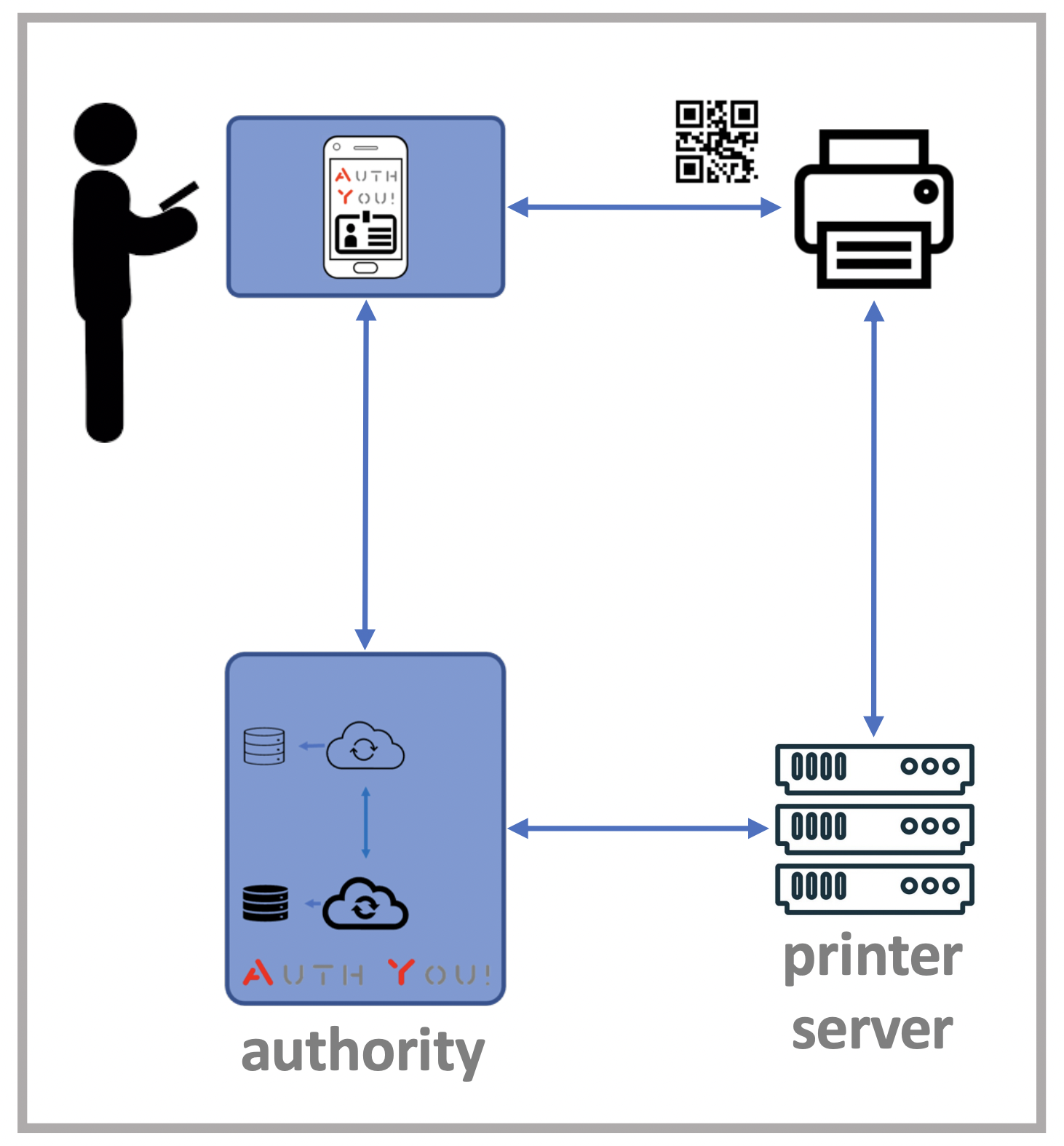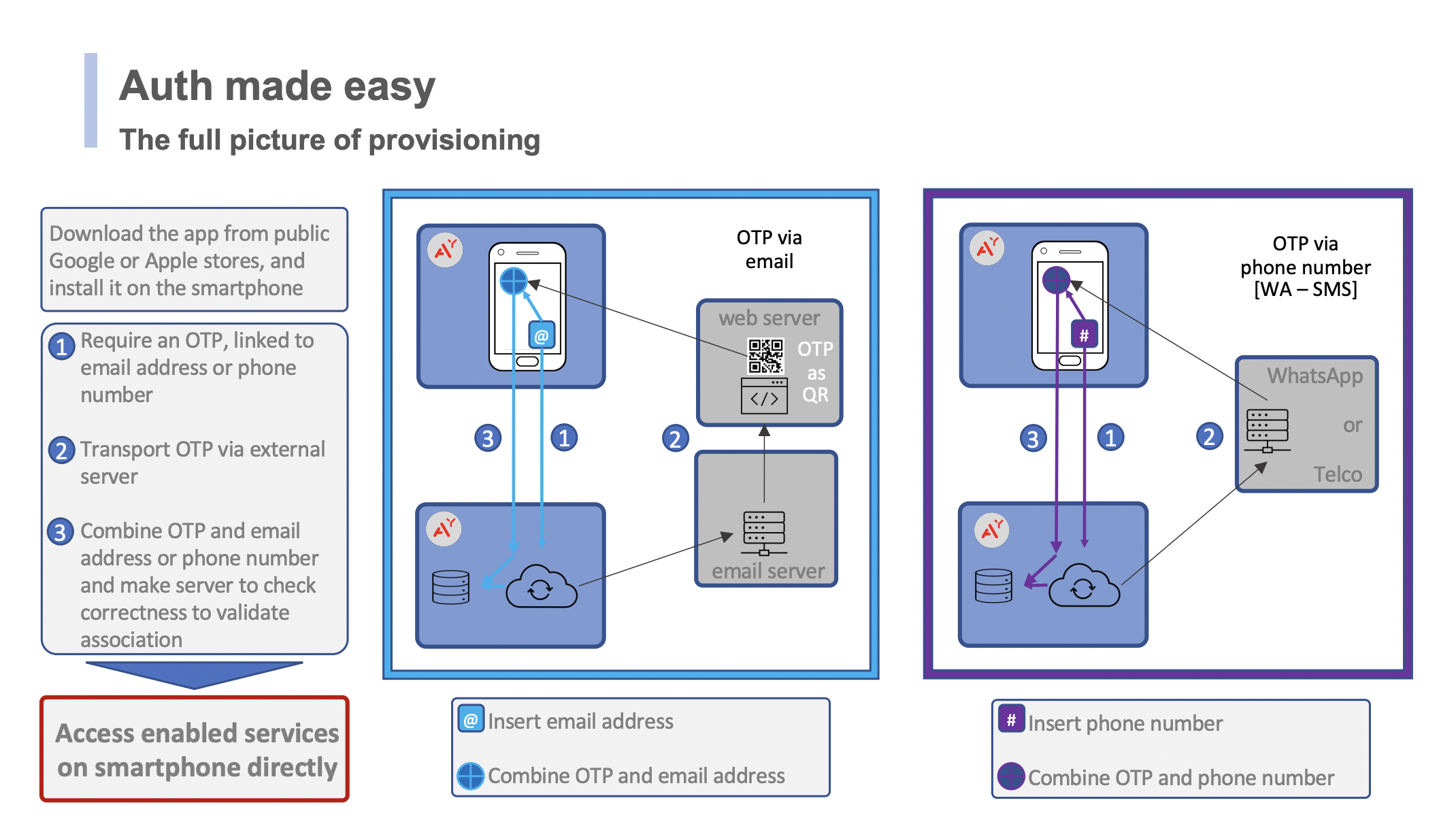 ********************************************************************************** ********************************************************************************** 1) USER SETUP ********************************************************************************** ********************************************************************************** To setup the app, the user needs to own an email address, and to use also another device where a browser is installed When the user inserts the email address in the "Settings" tab of the app and presses the button "send One-Time-Code" [1], the backend system generates a unique link, sends [2] it via email to the address specified by the user. When, on the second device, the user receives the email message and clicks on the link [3], a web page is opened in the browser, on the identityAuthority site This web page display a new token [4] in a QR format, and the the user, with the app on smartphone, presses the "scan QR" button and acquires the QR code [5]. This action ends the registration process, the app stores the email address. The user has indeed demonstrated to have been able to access to the email address ![]() <optional> The identityAuthority site, where the QR code was displayed to complete the user setup, also offers the facility to test that the configuration ended properly Indeed a new page is shown when the user setup process ends, and this includes a new oneTimeToken. By the "web" tab of the app, the user can now scan that code; the app will tell to the backend server that this user has acquired that specific token. The backend server will update the web page, showing the user own private data. In this test facility the server will retrieve and show the email address which is bond to the acquired token. </optional> |